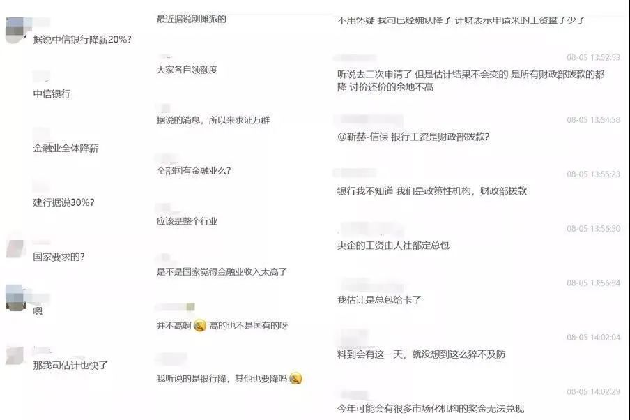 8月5日晚间,一份金融机构降薪的聊天记录在朋友圈流传。聊天记录中爆料,应政策要求影响,全国金融业要全体降薪,其中谈及中信银行和建设银行要分别降薪20%、30%。