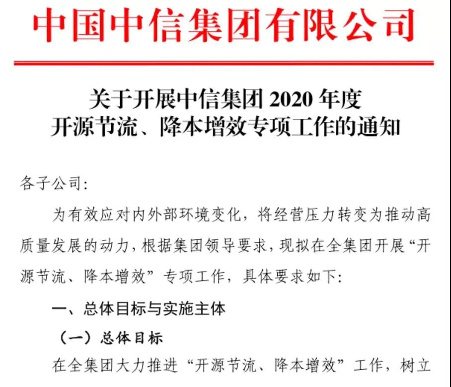 中信集团的这份通知中提到,拟在全集团开展“开源节流、降本增效”专项工作。通知要求在2020年度开源增效50亿元,节流降本100亿元。实施主体覆盖集团、股份、有限三层总部与各一级子公司,由各一级子公司向下属各级子公司层层传导分解管控目标。