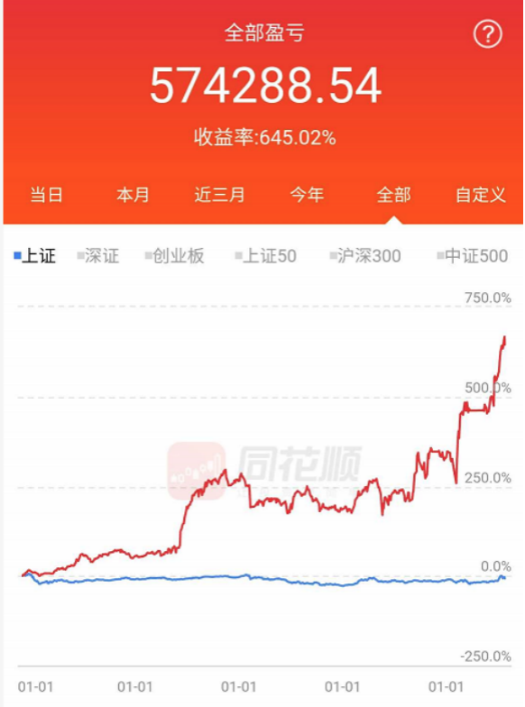 三哥展示了一个当初5w起步的账户,现在有57万,同花顺只记录了从16年到现在的收益率,这个数字是645.02%。