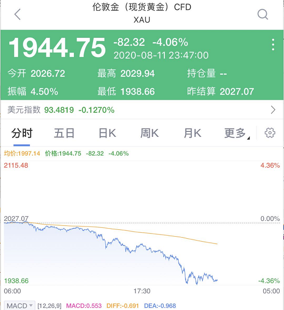 8月11日,现货黄金价格持续下行,14时30分前后跌破2000美元/盎司,回吐过去一周涨幅。截至16时,价格一度重回2000美元以上,日内最低报1989.49美元/盎司,跌幅逾2%。