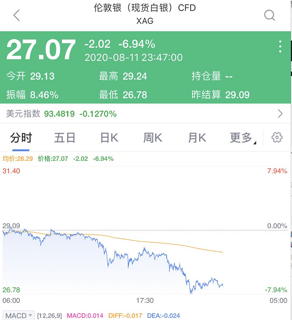 到了11日晚间,现货黄金持续跳水,跌破1940美元/盎司,日内跌4.4%,较历史高位跌去近135美元。现货白银跌破27美元/盎司,日内一度跌逾8%。