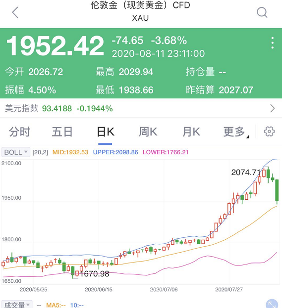 这与过去一段时间黄金快速上涨形成对比。在7月27日现货黄金价格打破此前历史最高纪录1921美元/盎司后,8月5日凌晨突破2000美元关口,8月7日进一步突破2070美元/盎司,两周时间涨幅超7%。