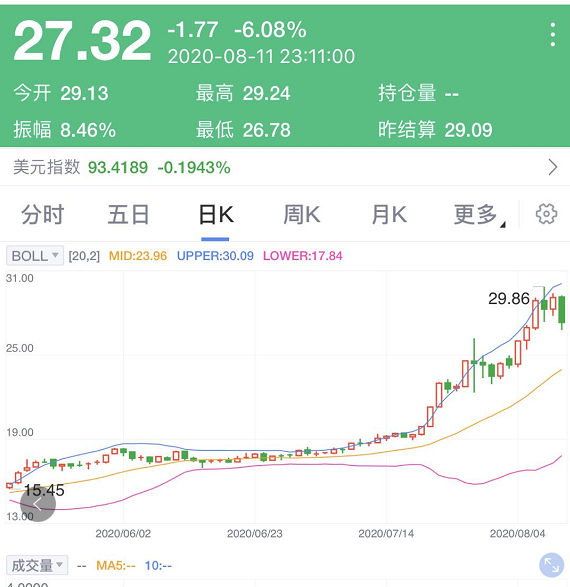 进入7月随着新冠肺炎疫情的蔓延,贵金属呈现一波明显的牛市,白银从7月20日开始,出现较明显的上攻形态,半个月左右的时间,累计涨幅达到4成。其中,7月21日、7月27日和8月4日三个交易日的涨幅都超过8%,7月27日表现最为凌厉,全日上涨幅度达到11.54%。白银的累计涨幅一度达到55%, 若从3月份的低点11.64美元/盎司来看,白银的涨幅在4个多月的时间已经实现翻倍。