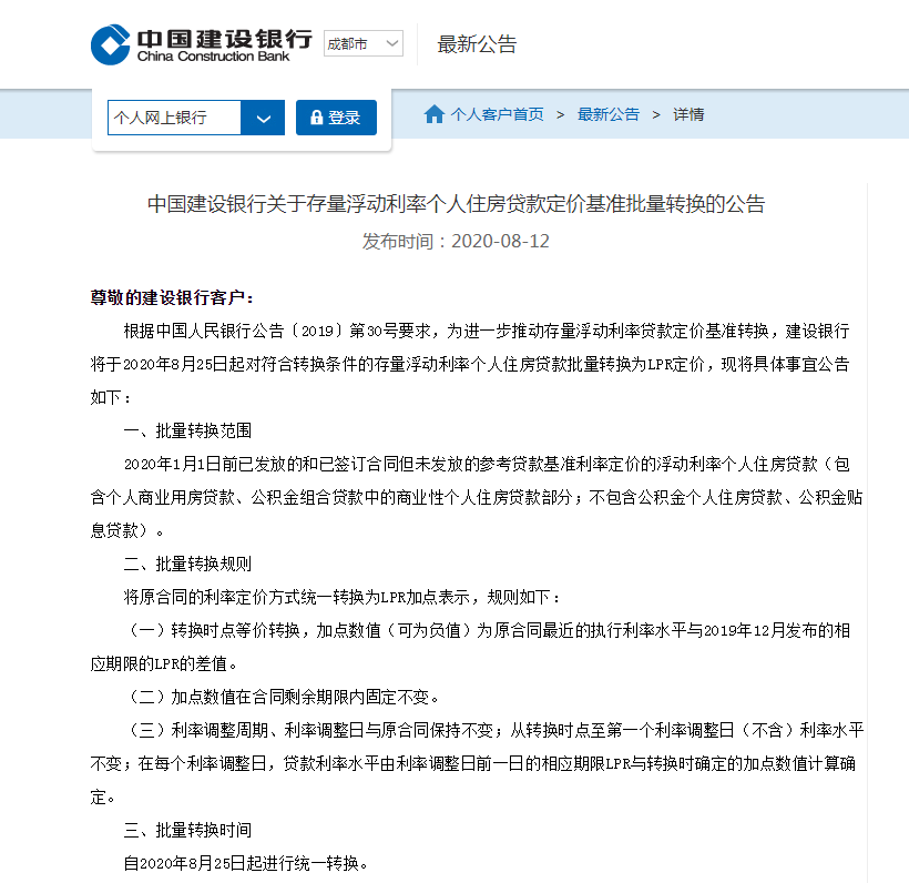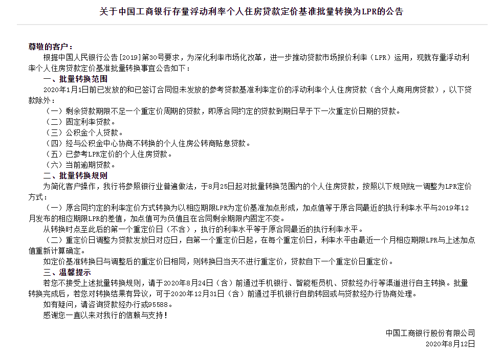 8月12日,工商银行、农业银行、中国银行、建设银行、邮储银行等五家国有大行均发布公告称,将于8月25日起,对符合转换条件但尚未办理转换的存量浮动利率个人住房贷款定价基准批量转换为LPR。