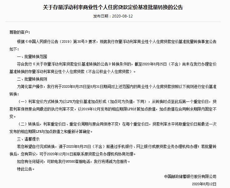 LRP今天又上热搜了。今日工建农中邮储五家国有大行同时发布公告,将于8月25日起对批量转换范围内的个人住房贷款,按照相关规则统一调整为LPR定价方式。公告同时明确,批量转换完成后,若对转换结果有异议,可于2020年12月31日(含)前通过相关渠道自助转回或与贷款经办行协商处理。