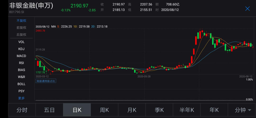 数据显示,非银板块近期处于调整状态,近五日跌1.57%。