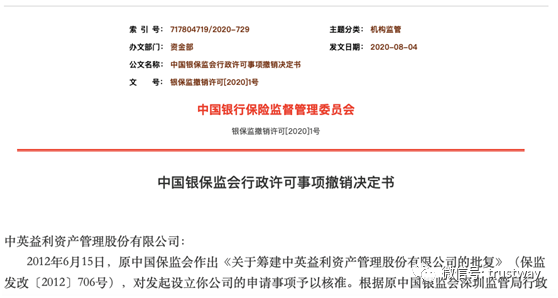 8月12日,中国银保监会通报,决定撤销2012年同意华润信托发起筹建中英益利保险资产管理公司的行政许可。