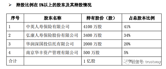 此后,信泰人寿将所持中英益利股权转让给了弘康人寿,上海凯石转让给了南京华丰资产管理。目前,公司有4个股东。