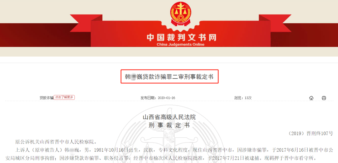 韩某巍因犯贷款诈骗罪和职务侵占罪,于2018年12月被山西省晋中市中级人民法院决定对韩某执行无期徒刑,剥夺政治权利终身,并没收个人全部财产,并责令退赔七家银行的损失合计2.5亿元。2020年1月,山西省高院二审裁定维持原判。