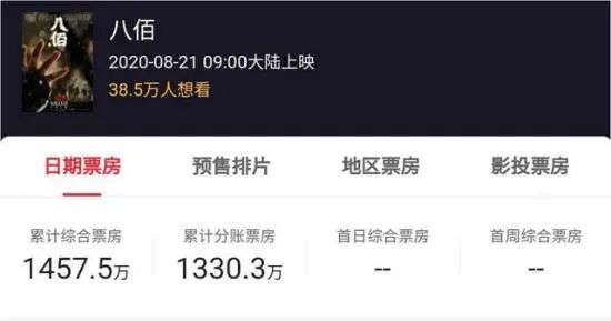 另据“猫眼专业版”数据,电影《八佰》8月14日点映场累计综合票房为1457.5万。