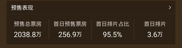 截至目前,电影《八佰》预售总票房为2038.8万,首日排片占比高达95.5%。
