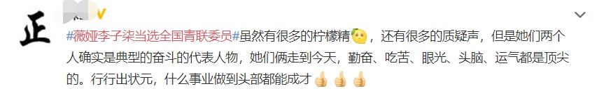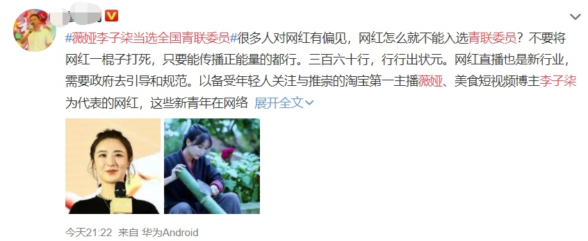 大部分的网友对薇娅、李子柒等网红当选全国青联委员表示支持。