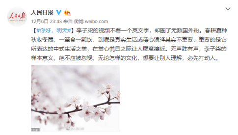 人民日报数次赞扬李子柒,评价道:李子柒视频展现的,恰恰是中华民族那些曾经影响世界许多年的文化,那些珍贵的精神内核正是讲好中国故事的绝佳代表。我们需要更多的“李子柒”,从不同角度、不同侧面,向全世界展示一个既富有独特的传统文化内涵,又不断向现代化前行的丰富、多样、精彩的中国。