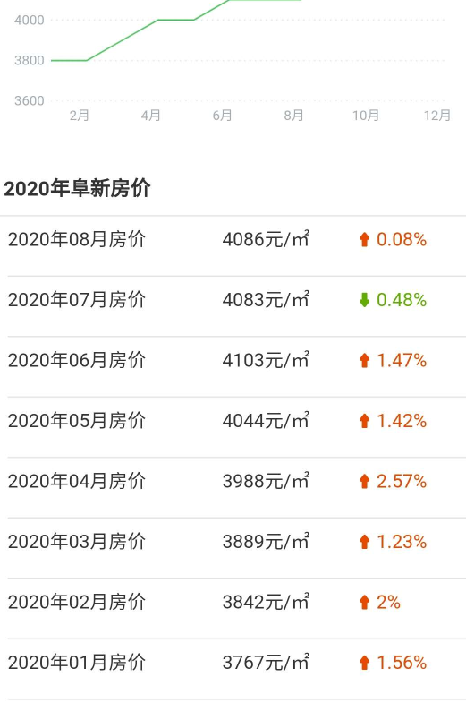 安居客统计数据显示,2005年至今,阜新的房价基本是在3700元/㎡至4200元/㎡之间波动,期间的绝大部分时间是在4000元/㎡以下运行。今年5月至今,阜新的房价已经连续4个月处于4000元/㎡以上,2020年8月房价为4086元㎡。