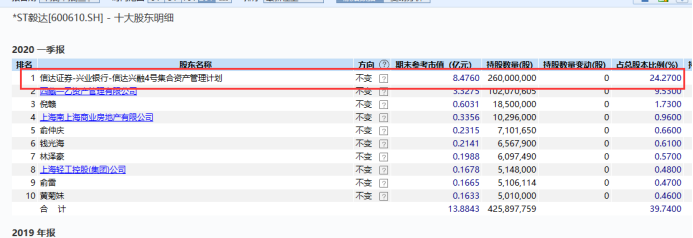 2019年初,*ST毅达公告称,控股股东由大申集团有限公司变更为信达证券-兴业银行-信达兴融4号集合资产管理计划。信达证券作为控股股东资管计划的管理人,代为行使股东权利。