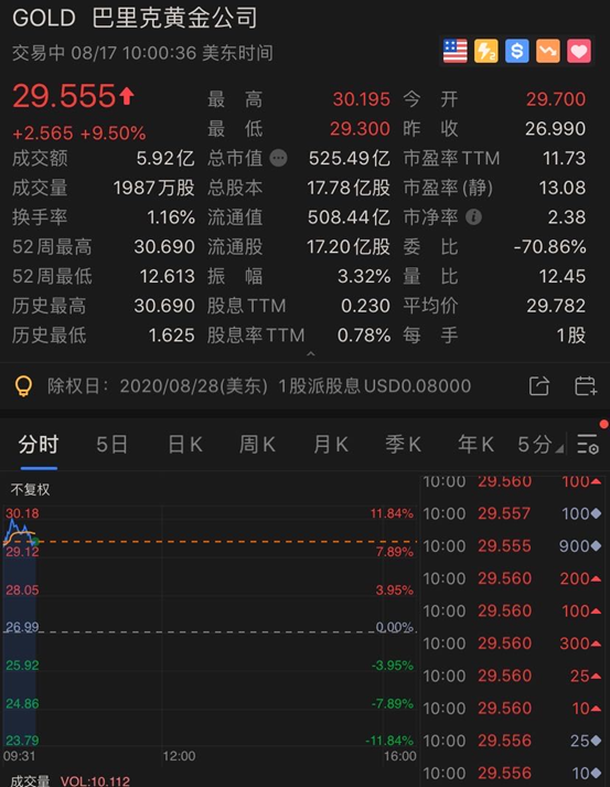 巴菲特的这次举动有了类似“点石成金”的效果,巴里克黄金公司开盘后一度涨近12%。