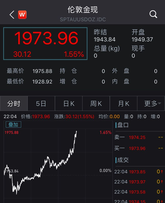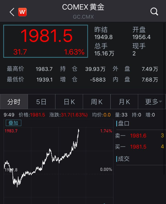 黄金价格今天也迅速拉升。Comex黄金重回1980美元/关口。
