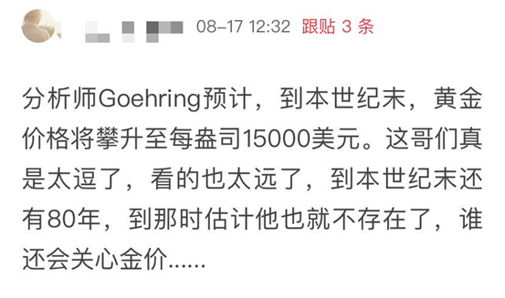更有人放出豪言称,金价在本世纪末能涨到15000美元,而金价近期的回调或是最后一次入场机会。Goehring & Rozencwajg Leigh Associates管理合伙人Leigh Goehring认为,他预计金价今年将跌破每盎司1,700美元,到2020年将重回每盎司15,000美元的轨道。