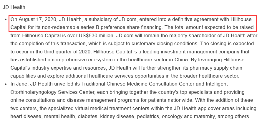 今日京东集团公布Q2财报显示,8月17日,京东集团子公司京东健康与高瓴资本就京东健康B轮不可赎回优先股融资签订了最终协议。