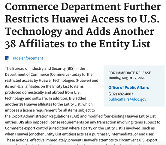 美国商务部工业和安全局(BIS)当地时间周一宣布,将进一步限制华为技术公司及其在实体清单上的非美国分支机构使用美国技术和软件生产的产品。此外,BIS在实体清单中又增加了38家华为分支机构,且对所有受美国《出口管理条例》(EAR)约束的项目都提出了许可证要求,并修改了四个现有的华为实体清单条目。