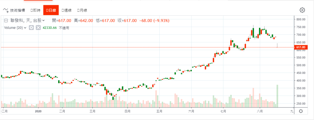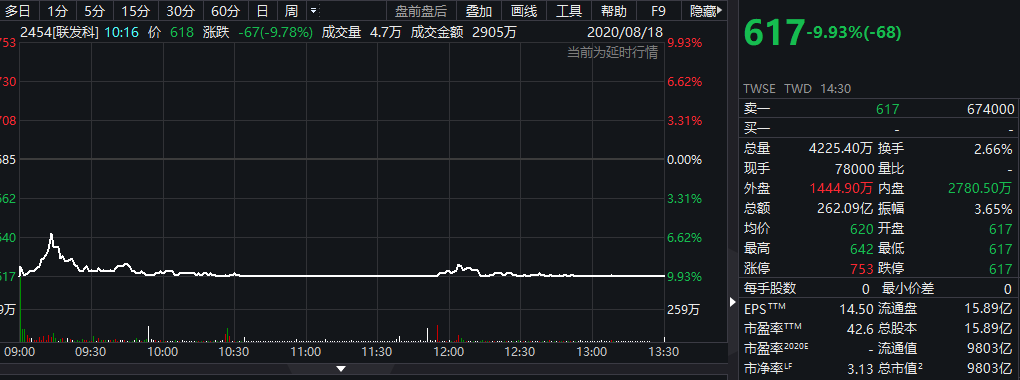美国扩大对华为禁令,将38 家子公司列入黑名单,市场预期联发科芯片出货恐受冲击,今日股价亮灯跌停收617 元,市值失守万亿台币大关。在此之前,联发科年内最大涨幅已经超过1倍。