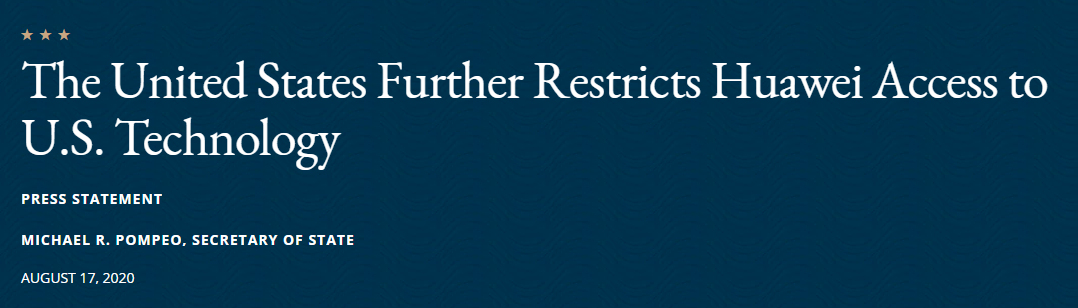 美国国务院官网发布的声明中表示,美国国务院大力支持商务部扩大其《外国直接产品规定》,该规定将防止华为通过替代芯片生产以及提供使用从美国获得的工具生产的现成(OTS)芯片来规避美国法律。在此之前,华为一直在试图逃避国外直接生产产品规定的限制。