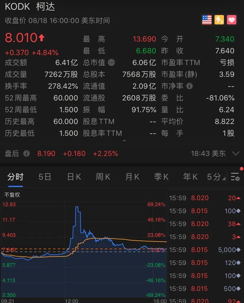 此前,7月28日,柯达宣布获得美国联邦政府7.65亿美元贷款转型药品生产,其股价在三天内飙升近1600%,7月30日盘中更是“熔断”了20次。