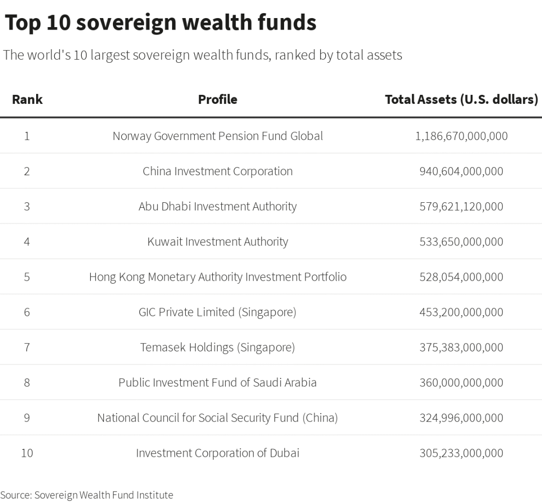全球前十大主权基金:最大为挪威政府养老金,中投公司和全国社保基金分列第2和第9位。数据来源:主权财富基金协会