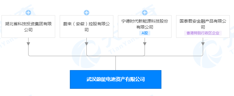 天眼查数据显示,武汉蔚能注册资本为8亿元,是一家包含港澳台投资的有限责任公司。其四家股东分别是宁德时代新能源科技股份有限公司、蔚来(安徽)控股有限公司、国泰君安金融产品有限公司以及湖北省科技投资集团有限公司,但并未公布具体持股比例。