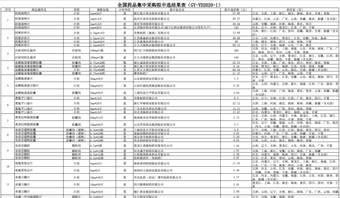 8月20日晚间,在经过申报、竞标之后,上海阳光医药采购网公布全国药品集中采购(采购文件编号:GY-YD2020-1)拟中选结果,进行公示。