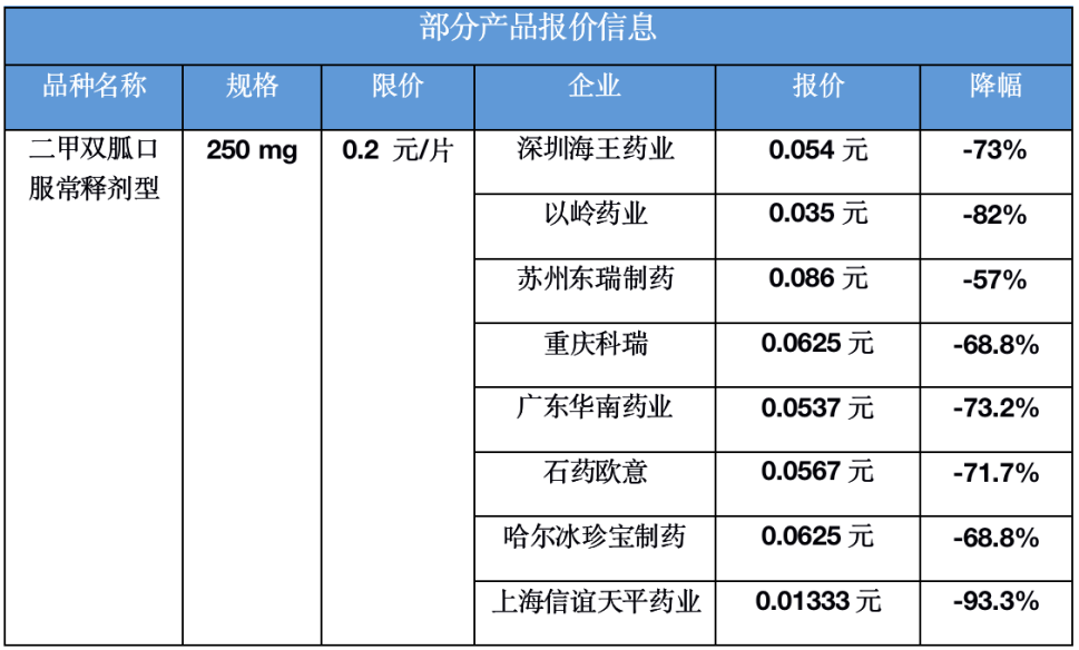 其中,竞争最激烈品种盐酸二甲双胍片常释片0.25g规格报出的最低价接近1分钱,上海信谊天平药业0.01333元,价格甚至不到最高有效申报价0.2元的10%,降价幅度远超过90%。