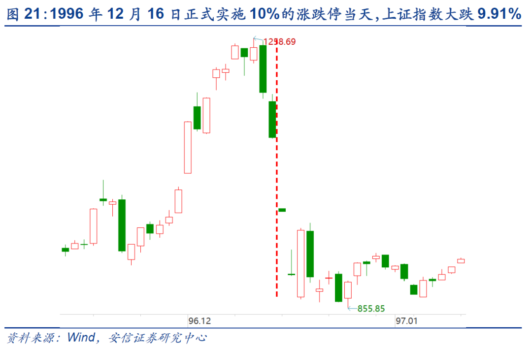 从历史上看,96年A股将涨跌停幅度从无限制调整到10%时,短期内对市场造成了一定的负面冲击。