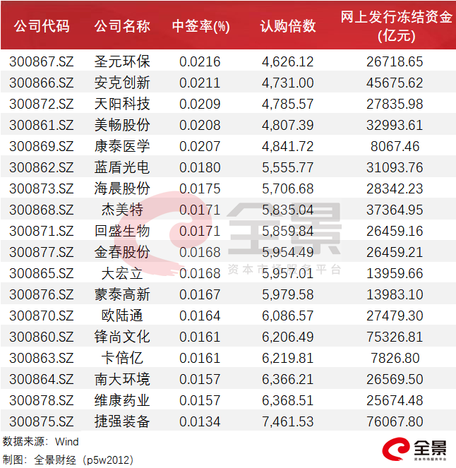数据统计显示,锋尚文化和美畅股份等18只新股网上申购中签率平均为0.0177%,而2016年初至2020年7月末,创业板新股网上申购的平均中签率为0.0262%。