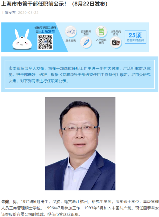 8月22日,上海市委组织部发布市管干部任职前公示,现年49岁的国泰君安证券副总裁朱健有新的动向,显示为“拟任市管企业正职”。