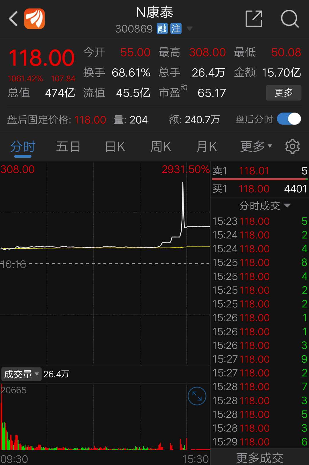 值得注意的是,盘中N康泰股价一度冲高至308元,涨幅近3000%,接连触发临停。
