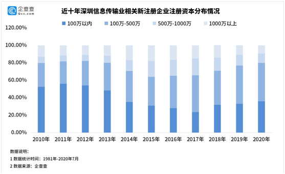2012年之后,深圳信息传输业进入转型提升、跨越发展的重要时期。企查查数据显示,2010年,深圳信息传输业共新注册3700余家企业,其中注册资本在100万以内的相关企业占新注册总量的52.42%;2012年之后,注册资本在100万-500万的信息传输业新注册企业占比持续走高;2014年,注册资本100万-500万的信息传输业新注册企业占比首次超过注册资本100万以内的,略高0.29%;2019年,注册资本100万-500万的信息传输业新注册企业占比已达43.89%,注册资本100万以内的占比32.94%,二者相差10.94%。从最近的十年来看,深圳自身产业调整和结构转型步伐逐渐加快。