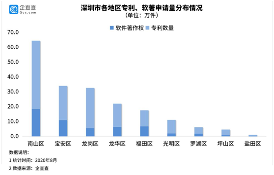 2019年,深圳专利申请量在全国大中城市中排名第一。企查查数据显示,2019年深圳国内专利申请量为26.2万件,占全国专利申请量的6.23%,占在全国大中城市排名第一,同比增长14.39%。截至2020年8月,深圳市累计软件著作权申请量达53.4万件,累计专利申请量达141.3万件,分别占全国的12.01%和7.27%。