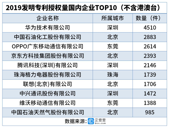 2019发明专利授权量前十的国内企业中,3家位于深圳。企查查数据显示,2019年,中国发明专利授权量排行前十国内企业(不含港澳台)中,共有3家企业位于深圳,依次为华为技术有限公司,腾讯科技(深圳)有限公司和中兴通讯股份有限公司。其中华为技术有限公司发明专利授权量最高,达4510件。