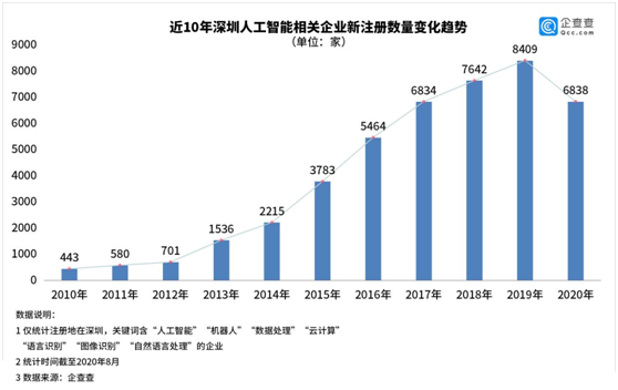 企查查数据显示,截至2020年7月底,深圳市人工智能相关企业总量超过4.6万家,2013年之后注册的居多,主要分布在南山区(1.4万家)、宝安区(0.9万家)、龙岗区(0.6万家)。