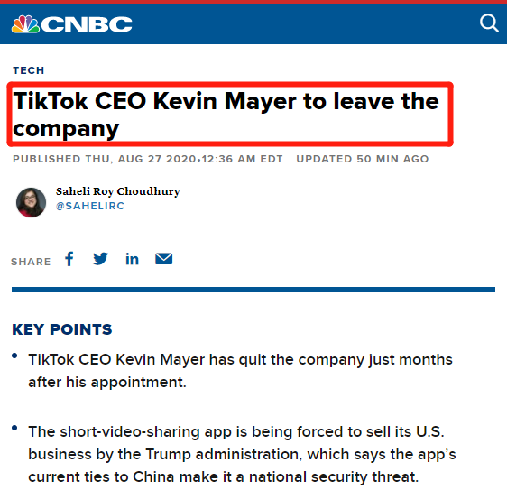 没想到上任不到3个月,TikTok首席执行官凯文·梅耶尔(Kevin Mayer)就辞任了。