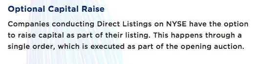 按照该提议,希望在纽交所上市的企业,可以无需IPO,在交易首日以大额交易的形式将新股出售给公众。而此前,已SEC获准的直接上市企业并不能发行新股,只能让现有投资者出售股票。