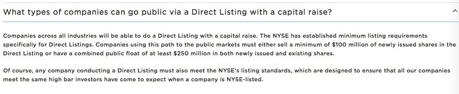 此外,纽交所还在官网的常见问题解答中表示,所有行业的公司都可以通过“直接上市”模式融资并上市;纽交所为直接上市制定了最低上市要求,采用这种方式上市的公司必须在直接上市时出售至少1亿美元的新发行股票,或者在新发行股票和现有股票中至少有2.5亿美元的公共流通股。但纽交所也提示,任何直接上市的公司也必须符合纽交所的上市标准。
