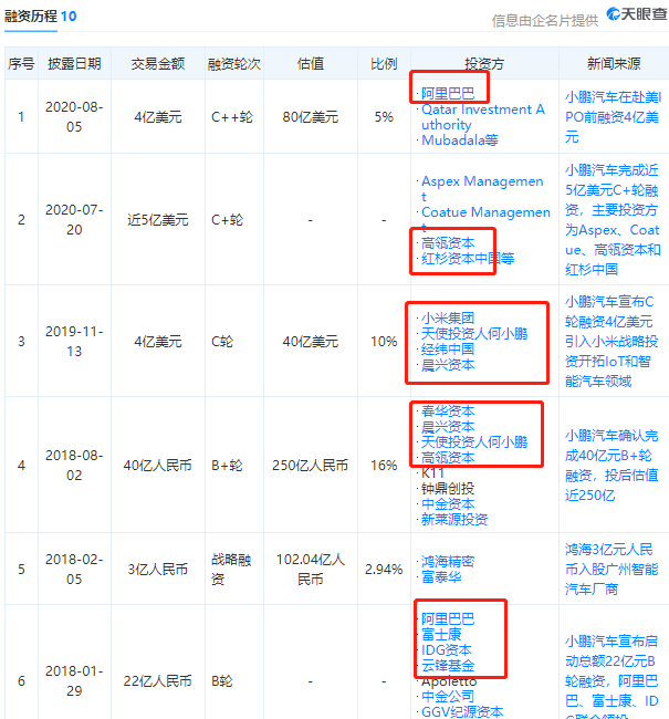 2020年8月初,小鹏汽车又曝出新融资超过4亿美元,阿里领投,投资方包括卡塔尔主权财富基金和阿布扎比基金,估值80亿美元。