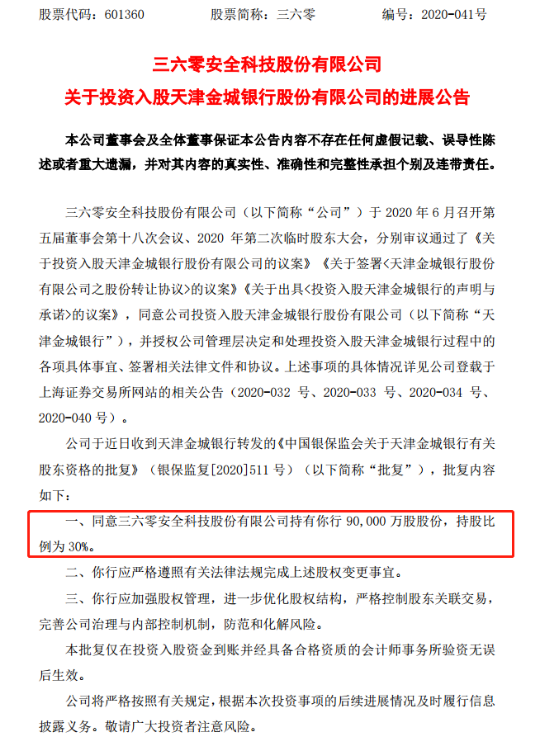 8月26日晚间,360集团(601360,SH)公告,近日已经收到天津金城银行转发的《中国银保监会关于金城银行有关股东资格的批复》,同意360集团持有天津金城银行9亿股股份,持股比例为30%。