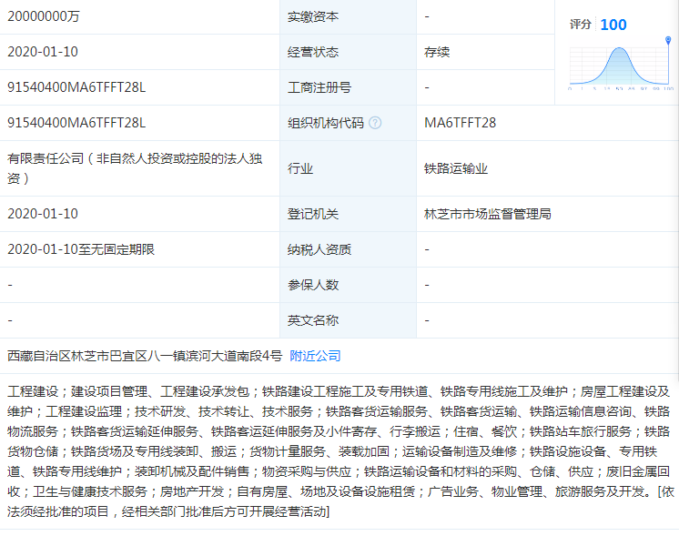 话音刚落,2020年1月10日,川藏铁路有限公司正式成立,注册地点位于西藏自治区林芝市,注册资金2000亿元,该公司由中国国家铁路集团有限公司100%控股。2020年5月15日,川藏铁路四川有限公司成立,注册资金800亿元,该公司有川藏铁路有限公司100%控股。