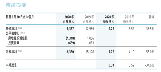 报告显示,期内长实集团总收入为363.23亿港元,股东应占溢利为63.6亿港元,较去年下降57.96%。此外,一向派息稳健的长实集团表示,2020年度中期股息为每股港币3角4分,相比较2019年减少了34.6%。