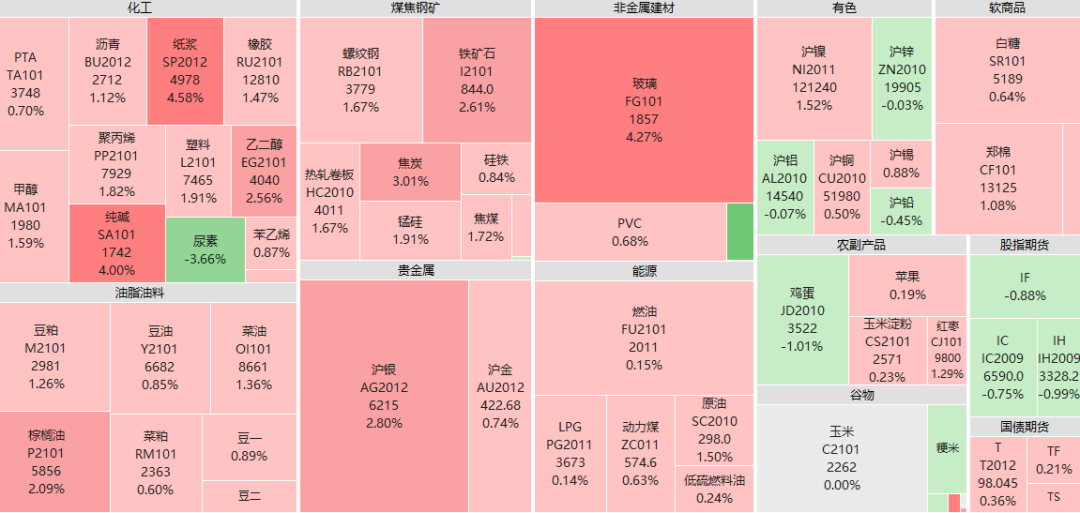 夜盘收盘,纯碱大涨2.67%,纸浆、郑油等涨超1%,螺纹期货收涨0.21%,热卷收涨1.08%,铁矿石期货收涨0.18%,焦炭收涨0.90%,焦煤收涨0.69%,动力煤收跌0.35%,橡胶收跌0.08%,沥青收涨0.07%,郑棉收涨0.08%。