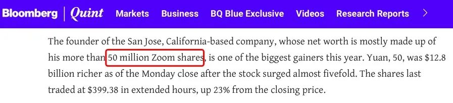据彭博社今夜报道,Zoom的CEO袁征对Zoom的持股超过5000万股。