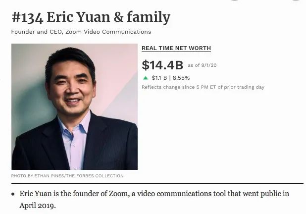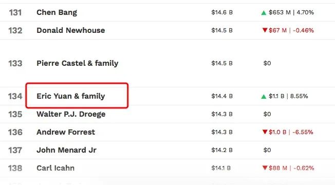 截至本周二(9月1日)美股盘前,在福布斯实时富豪榜上,袁征以144亿美金的身家排第134名。在股价大涨后,袁征的身家将超过200亿美金,进入全球富豪排行榜的前一百名,排名约在66名,身家超越刘强东。