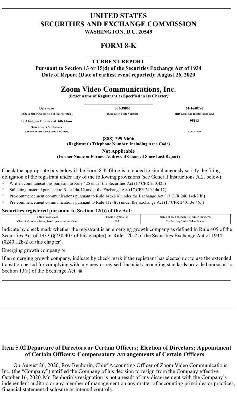 而值得注意的是,本周二美股盘前,Zoom公告称,首席会计官(CHIEF ACCOUNTING OFFICER)罗伊·本霍林(ROY BENHORIN)已通知公司决定从10月16日起辞职
